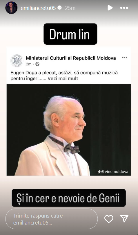 „Cu tristețe și mâhnire, am aflat vestea tristă că maestrul Eugen Doga a plecat dintre noi, mergând să compună îngerilor și să ne cânte din ceruri valsurile sale nemuritoare!