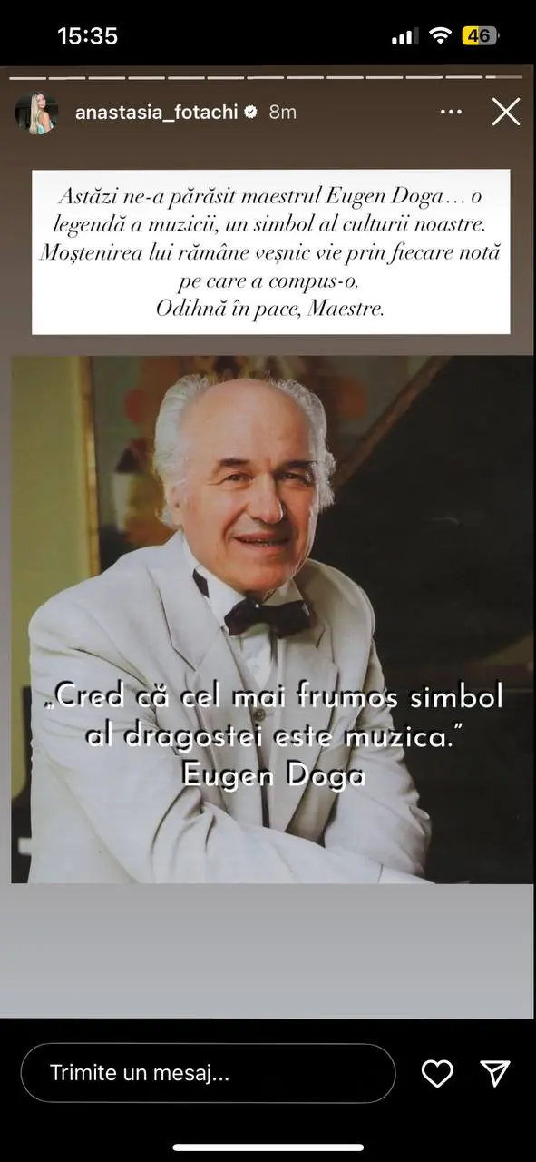 Vă mulțumim, Maestre Eugen Doga. Rămâneți cu noi prin fiecare notă, prin fiecare emoție, prin veșnicia pe care ne-ați dăruit-o.”