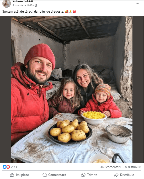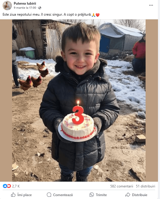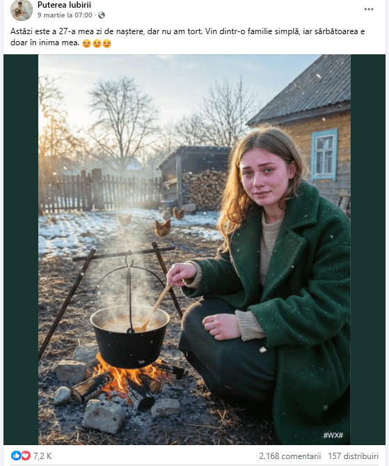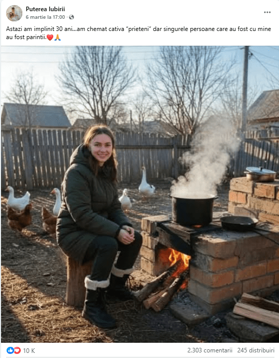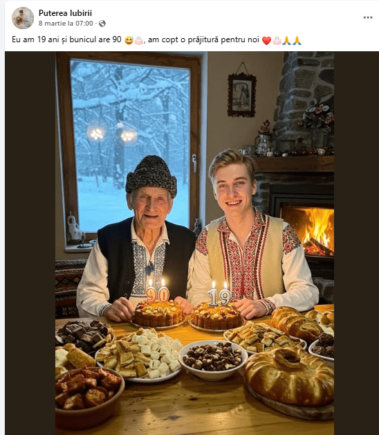 „Și totuși puțini sunt cei care utilizează instrumente de verificare pentru a confirma dacă această poză este reală sau e un fals. Încercați minim să treceți imaginea prin https://wasitai.com/ şi să vă convingeți dacă se merită să donați pentru “un tort” sau să distribuiți poze cu persoane care la 107 ani și-au copt prăjituri! Imaginile false generate cu ajutorul Inteligenței Artificiale au trecut în ultimul an la un alt nivel. Tehnologia din jurul lor s-a dezvoltat foarte mult și au devenit din ce în ce mai convingătoare. Acest tip de fraudă va lua amploare! Fiți informați şi protejați! Verificați orice informație în mediul on-line şi raportați mereu falsurile”