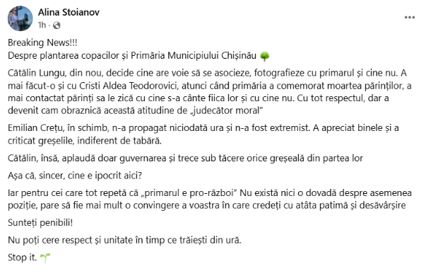 Actrița Alina Stoianov despre care se zvonea că a avut o relație amoroasă cu al ei coleg de breaslă, Emilian Crețu și despre care a spus anterior că îi este „mai aproape decât orice” – sare în apărarea acestuia, în conflictul influencerului cu Cătălin Lungu. Autorul proiectului ZERODOI l-a acuzat pe Emilian Crețu că îi spală imaginea primarului de Chișinău, Iv Ceban, cum îi spune actorul. Alina însă i-a reproșat atitudinea de „judecător moral” și că „aplaudă guvernarea”, сât timp Emilian „nu a propagat niciodată ura.”
