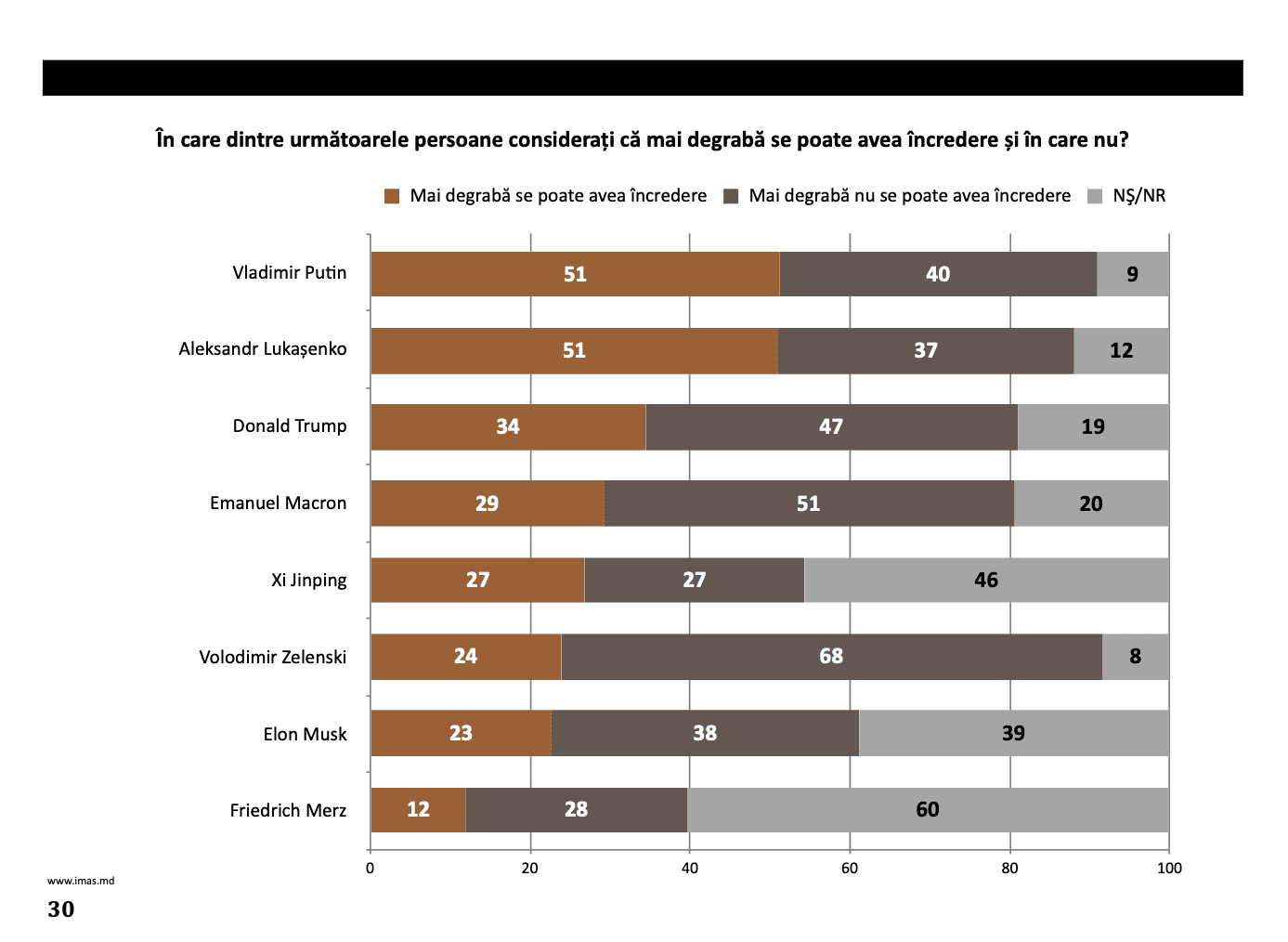 Moldovenii au mare încredere în Vladimir Putin și Alexandr Lukașenko, potrivit Barometrului Social Politic realizat de IMAS, la comanda Independent News România. Liderul de la Kremlin și cel de la Minsk sunt credibili pentru 51%.