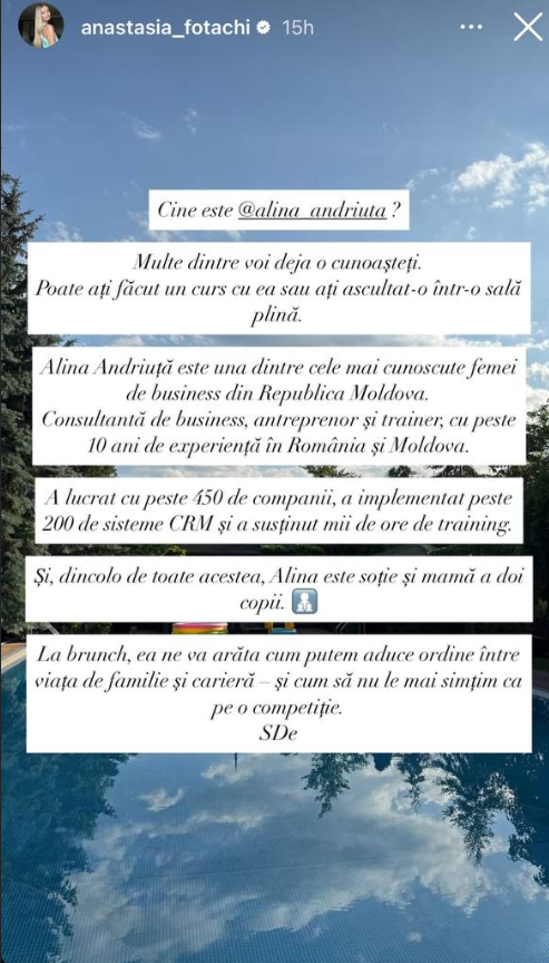 Fotomodelul, „Miss Bikini”, Anastasia Fotachi, soția milionarului Gabriel Stati a ajuns în milocul unui scandal, după ce o populară tiktok-eriță a criticat-o indirect, pentru faptul că învață femeile cum să îmbine viața personală și munca, în cadrul brunch-urilor sale. TikTok-erița Doina Frunze a spus că astfel de femei nu ar avea idee cum de fapt poți să îmbini aceste aspecte ale vieții, deoarece ele însele nu se ocupă de casă și copil, dar au bone și menajere, care preiau aceste sarcini de pe umerii lor.