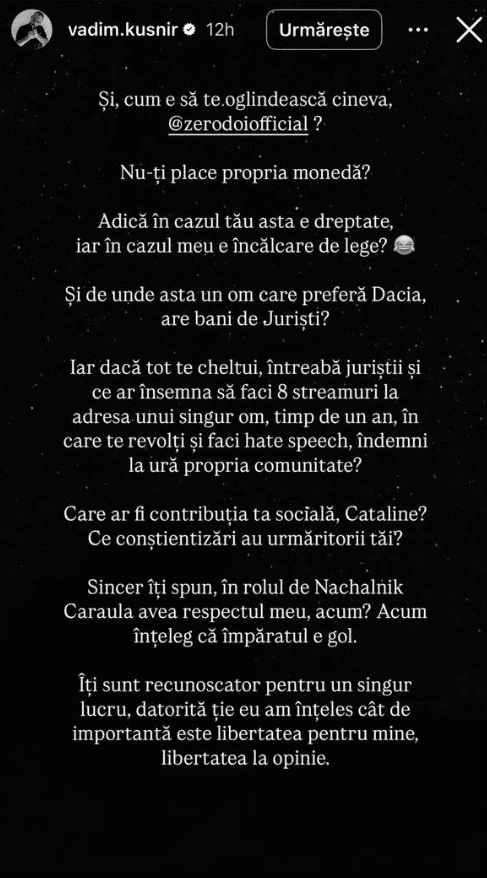 Ieri actorul Cătălin Lungu a anunțat că are de gând să-l dea în judecată pe specialistul în marketing și gazda unui podcast, Vadim Cușnir, după ce acesta a declarat la „Mama răniților„, că actorul ar fi fost plătit pentru a susține public partidul de guvernare. Lungu i-a spus să prezinte probele, în loc de asta, Cușnir a venit cu o reacție acidă la amenințarea de a fi dat pe mâna legii pentru defăimare, în care spune că i-a răspuns actorului cu aceiași monedă.