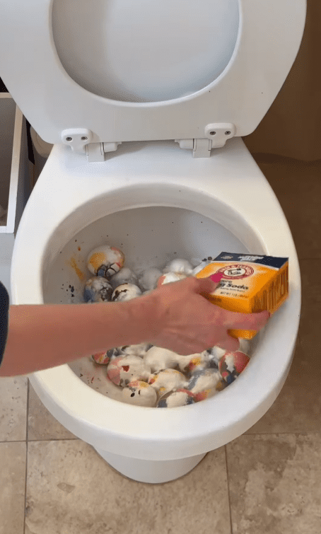 Kate arată clar cum așază ouăle în toaletă, după ce a blocat scurgerea cu o buretă, apoi adaugă coloranți alimentari, bicarbonat de sodiu și oțet, declarând cu nonșalanță că „e cea mai bună metodă”.