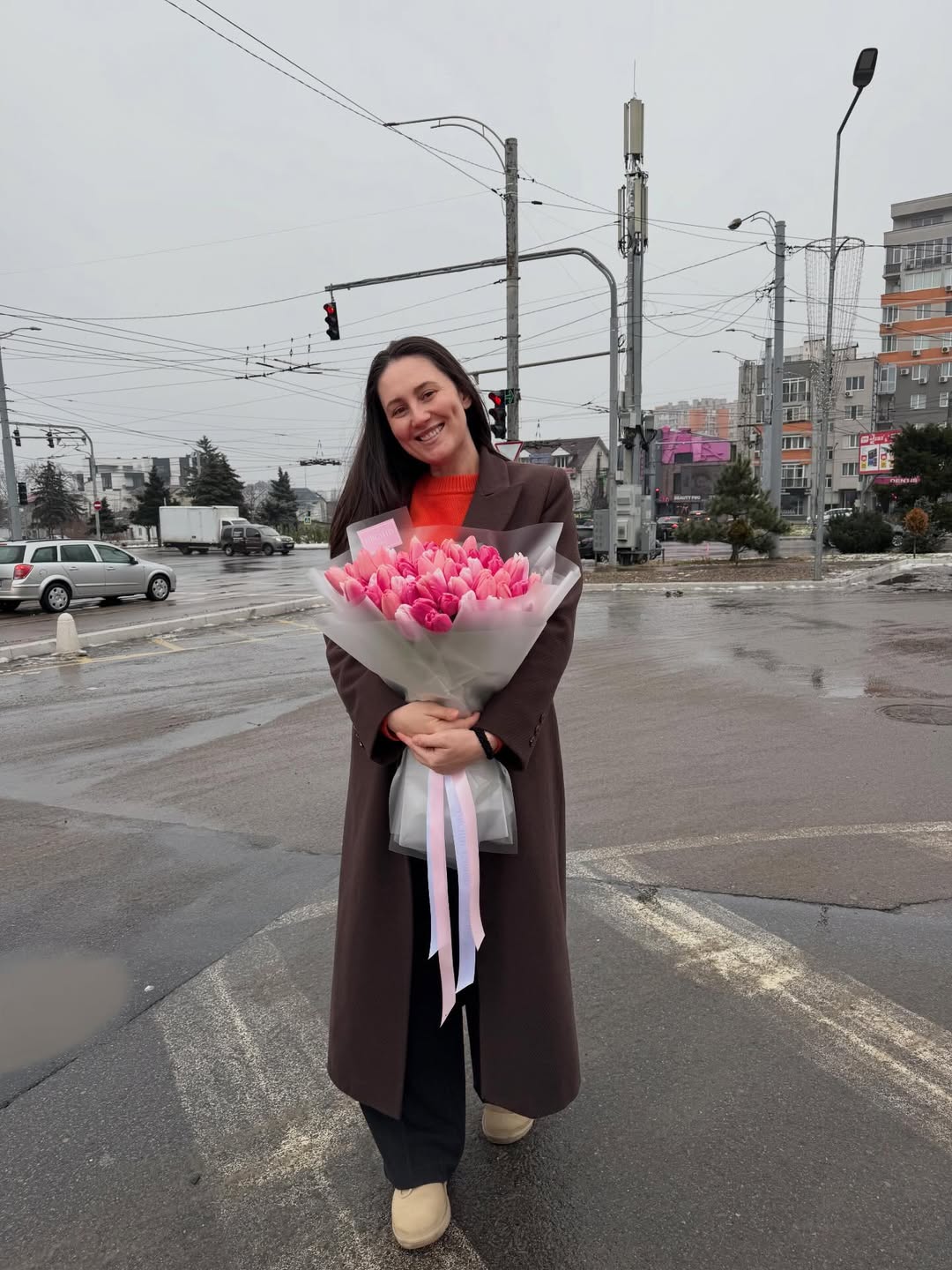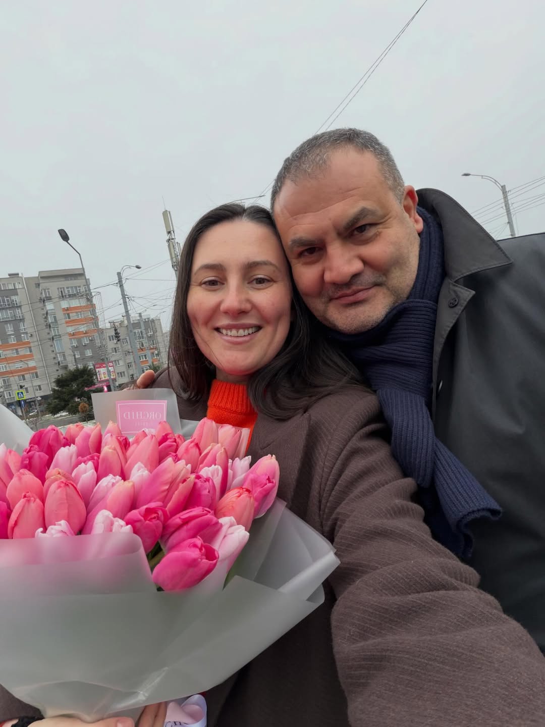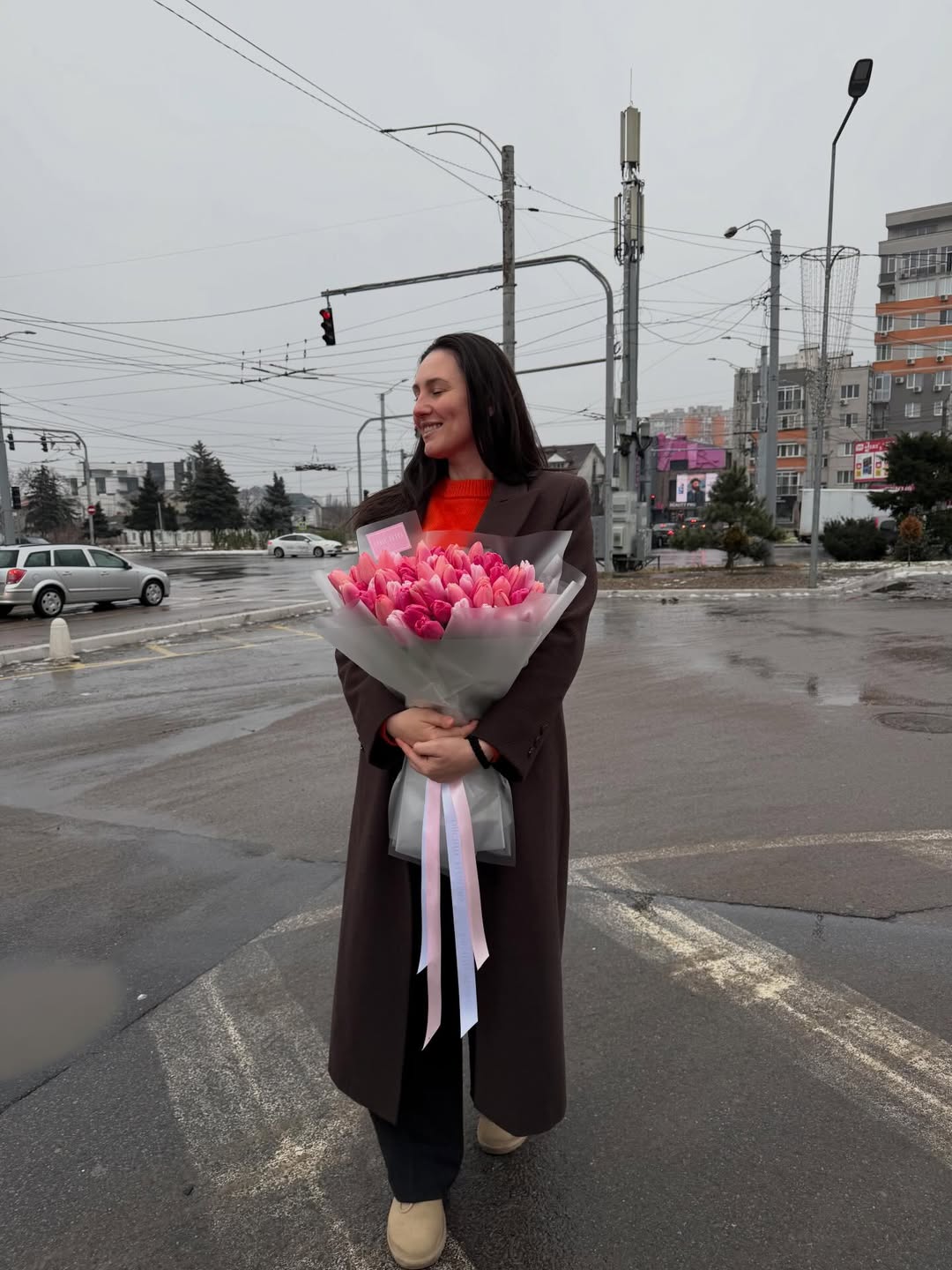Bărbatul i-a oferit un buchet de lalele roz în plină iarnă făcându-și soția să radieze de fericire.