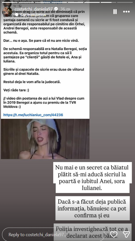 Daniela Costețchi, bloggerița șantajată și amenințată cu sicriu și cruce a publicat noi detalii pe marginea cazului ei investigat de Poliție. Potrivit ei, sicriul și crucea cu presupusa dată a morții sale a fost dusă la casa tatălui ei de iubitul Anei Beregoi, un tânăr pe nume Islam.
