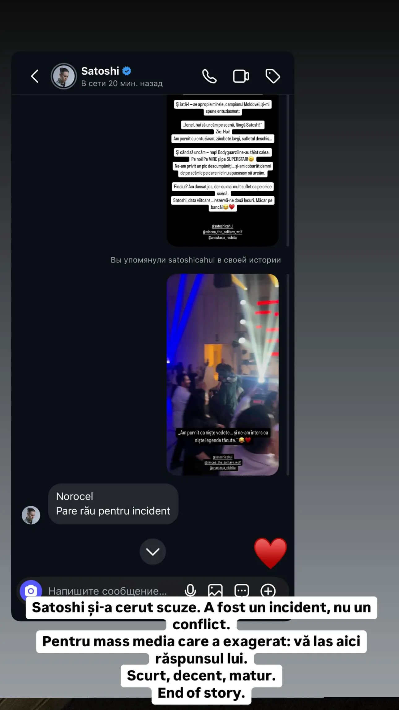 Artistul, fenomen al momentului, Satoshi, a cărui bodyguard i-a împiedicat pe Valeriu Mircea și Ionel Istrati să urce pe scenă alături de rapper, care a cântat la nunta campionilor – reacționează succint la acest incident. Vlad Sabajuc a răspuns la un InstaStory al lui Ionel Istrati, l-a salutat și scrie că-i pare rău pentru incident.