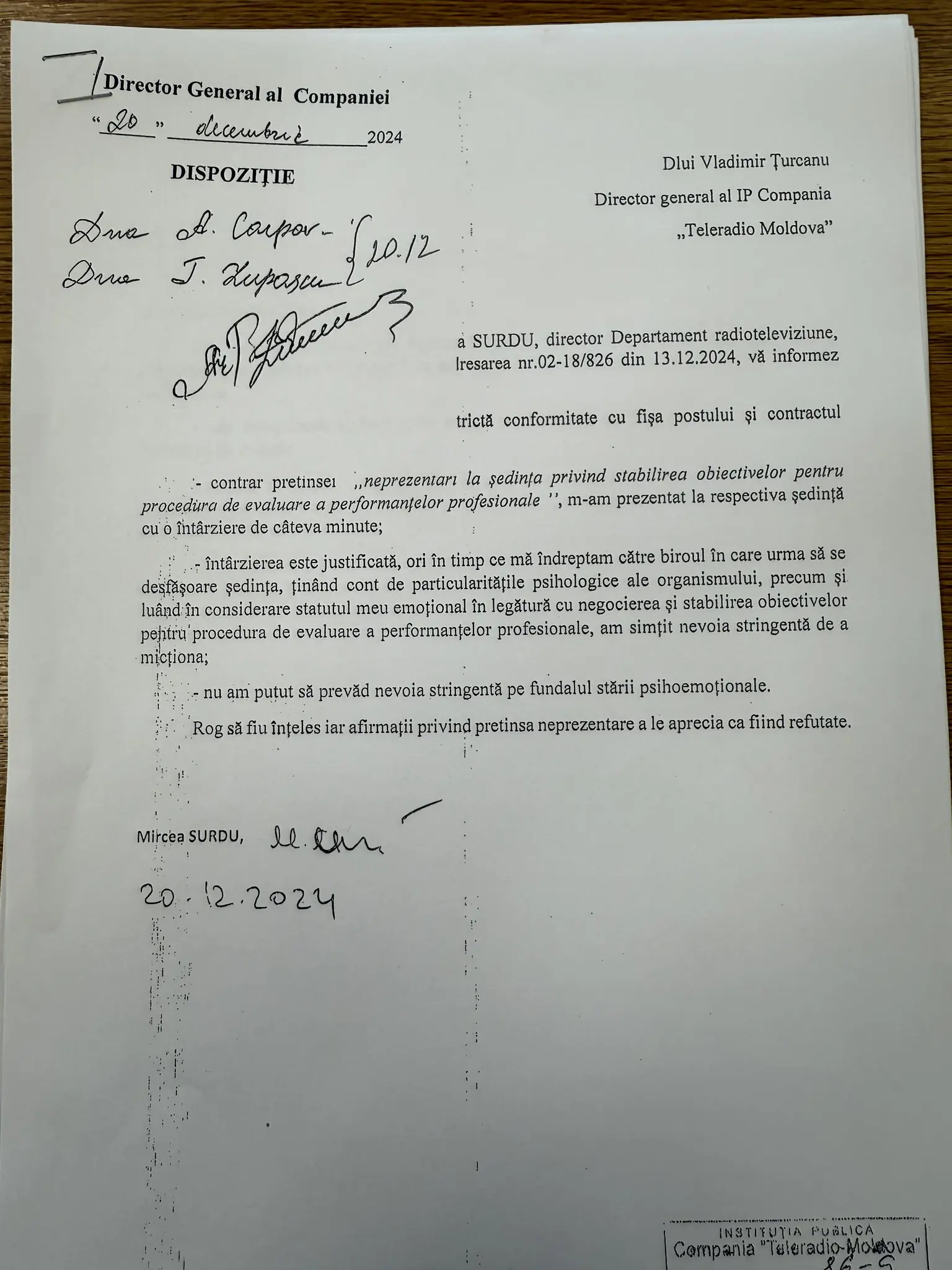 Documentul în cauză, semnat și datat de Surdu, confirmă cele spuse de Țurcanu, iar tonul justificării ridică semne de întrebare asupra profesionalismului cu care sunt tratate responsabilitățile manageriale în TRM.