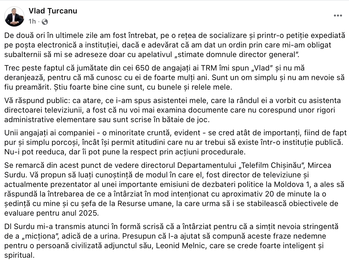 Amintim că, pe canale de Telegram, au apărut în ultimele zile capturi cu mesajul unei angajate din anticamera TRM, care nota că adresările către șeful instituției, care nu vor conține sintagma „stimate domnule director general”, nu vor fi acceptate. Internauții l-au criticat pe Țurcanu pentru această decizie, dar și au făcut haz pe seama lui.