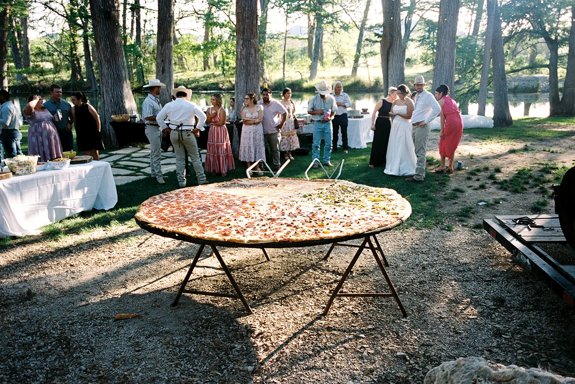 Și pentru că totul e mai mare în Texas, Brandon a pregătit și o a doua pizza, în formă de inimă, decorată cu inițialele mirilor din felii de pepperoni. Invitații au privit fascinați cum pizza prindea formă sub ochii lor.