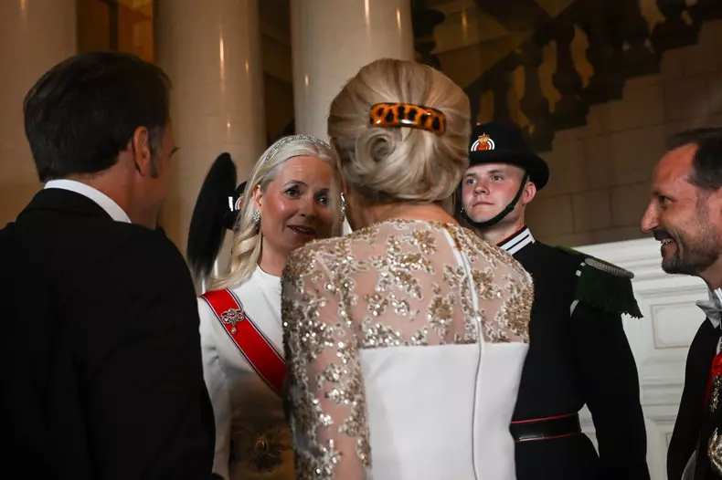 La întâlnirea cu Regele Harald al V-lea și soția sa, Regina Sonja, Prințul moștenitor Haakon și soția sa, Prințesa Mette-Marit, precum și fiica lor, Prințesa Ingrid Alexandra, prima doamnă a Franței a purtat o rochie de mireasă, creație a designerului Nicolas Ghesquière de la Louis Vuitton. Rochia semnată de Ghesquière s-a distins datorită mânecilor și gulerului din dantelă ornată cu paiete aurii. În completarea ținutei, Brigitte a ales un clutch bej, pantaloni stiletto albi și bijuterii cu diamante. Machiajul ei a fost luminos, iar părul și l-a purtat într-un coc la baza gâtului, prins cu o agrafă cu animal print, o alegere destul de neobișnuită în contrast cu prețiozitatea ținutei, scrie presa română.