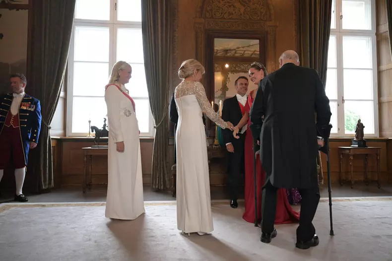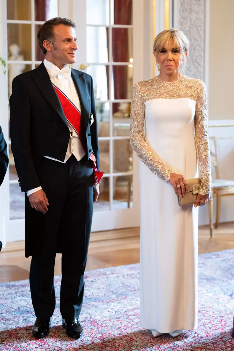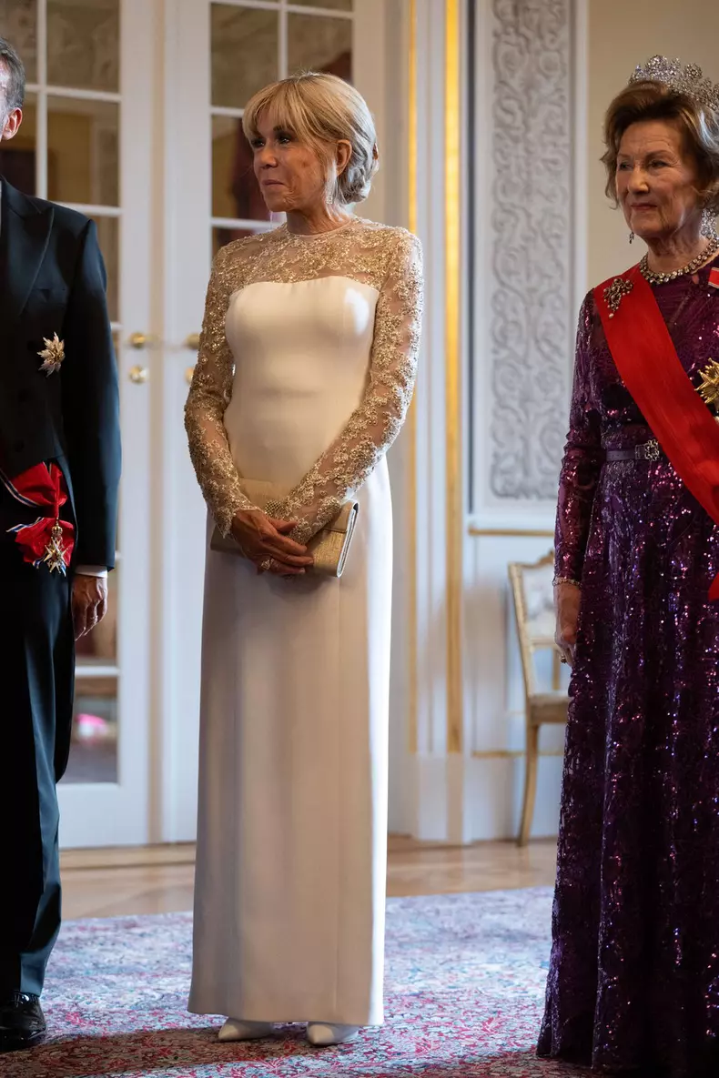 La întâlnirea cu Regele Harald al V-lea și soția sa, Regina Sonja, Prințul moștenitor Haakon și soția sa, Prințesa Mette-Marit, precum și fiica lor, Prințesa Ingrid Alexandra, prima doamnă a Franței a purtat o rochie de mireasă, creație a designerului Nicolas Ghesquière de la Louis Vuitton. Rochia semnată de Ghesquière s-a distins datorită mânecilor și gulerului din dantelă ornată cu paiete aurii. În completarea ținutei, Brigitte a ales un clutch bej, pantaloni stiletto albi și bijuterii cu diamante. Machiajul ei a fost luminos, iar părul și l-a purtat într-un coc la baza gâtului, prins cu o agrafă cu animal print, o alegere destul de neobișnuită în contrast cu prețiozitatea ținutei, scrie presa română.
