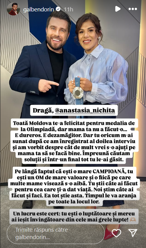 Jurnalistul Dorin Galben, la fel ca și multe alte personalități publice de la noi s-a arătat solidar cu Anastasia Nichita și și-a manifestat suportul pentru sportivă, în scandalul în care a fost atrasă de mama sa, care s-a plâns că fiica și ginerele refuză să o ajute, ea fiind cu degetele de la un picior amputate. Dorin Galben, care a realizat două interviuri cu luptătoarea și a mers la Paris să o susțină la Jocurile Olimpice, dă de înțeles că știe situația din interior și cât de mult și-a ajutat mama Anastasia Nichita.