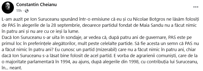 În replică, jurnalistul și scriitorul Constantin Cheianu a luat apărarea partidului de guvernare și a punctat că „PAS continuă să se afle pe primul loc în clasamentele preferințelor electorale”.