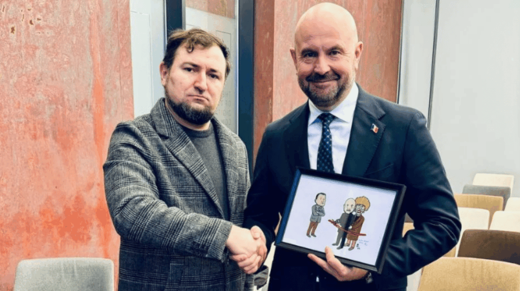 Vladimir Bolea și Dora, într-o caricatură! Ministrul a accepta-o în dar, convins că umorul e obligatoriu politicienilor