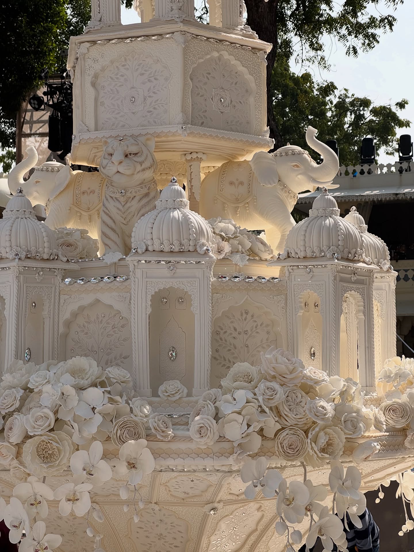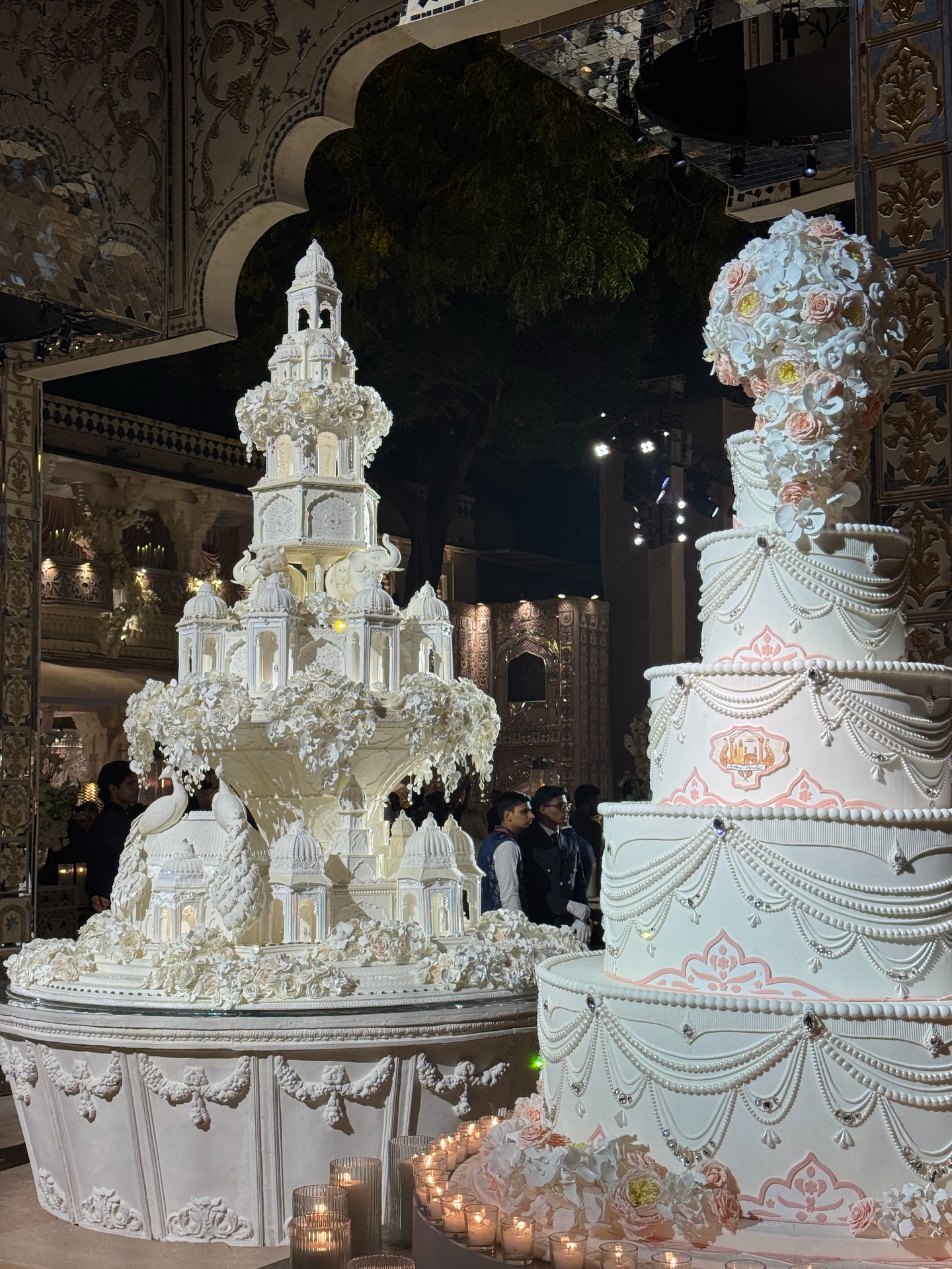 Tortul de nuntă a arătat absolut spectaculos. În formă de castel cu detalii tradiționale indiene, prăjitura a avut opt etaje uriașe. Ferestrele palatului au fost luminate și înconjurate de păuni, elefanți și flori realizate de un celebru chef din Franța. Prăjitura a prezentată publicului chiar în timpul concertului lui Jennifer Lopez.