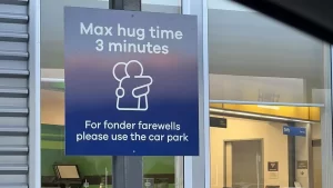 Aeroportul din Dunedin este cel care a impus limita de timp. Pentru a se asigura că oamenii știu despre această măsură, aeroportul cu pricina a montat chiar și un indicator: „Timp maxim de îmbrățișare 3 minute. Pentru despărțiri mai afectuoase, vă rugăm să folosiți parcarea”.