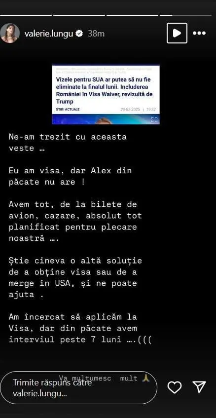 Valerie Lungu are Visa, dar iubitul ei nu, iar pentru interviul pentru a obține este abia peste șapte luni. Influencerița și-a întrebat următorii dacă există vreo altă cale pentru a putea ca iubitul ei să călătorească în America.