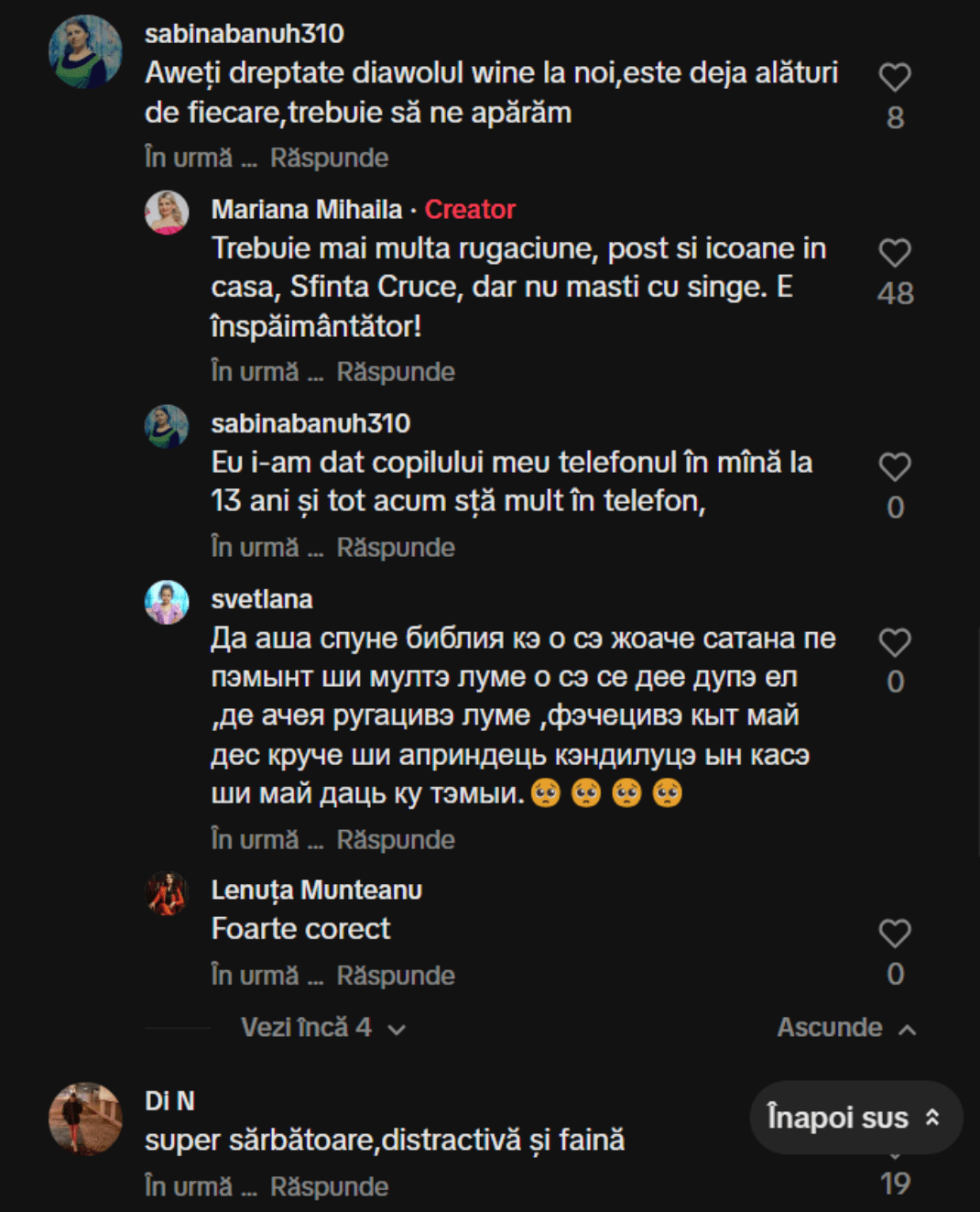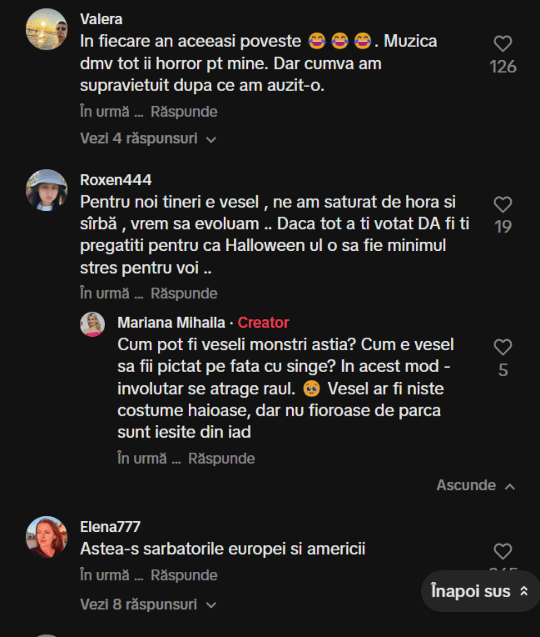 „Am venit să cumpărăm câteva pixuri și-mi fac cruce. Doamne Ferește și Apără! Doamne, Maica Domnului, ce a mai apărut prin magazine. Spuneți-mi, vă rog, asta-i frumos? Cui îi trebuie acest Halloween? Asta-i diabolic. Eu când văd, mă sperii. Asta-i vesel, asta-i sărbătoare? NU HALLOWEEN! Haideți să promovăm ceva gingaș, frumușel: toamna de aur, bogată cu roade, steluță, îngeraș. Numai nu nebuniile astea. Atragem răul inconștient”, a spus Mariana Mihăilă, într-un video publicat pe contul său de TikTok.