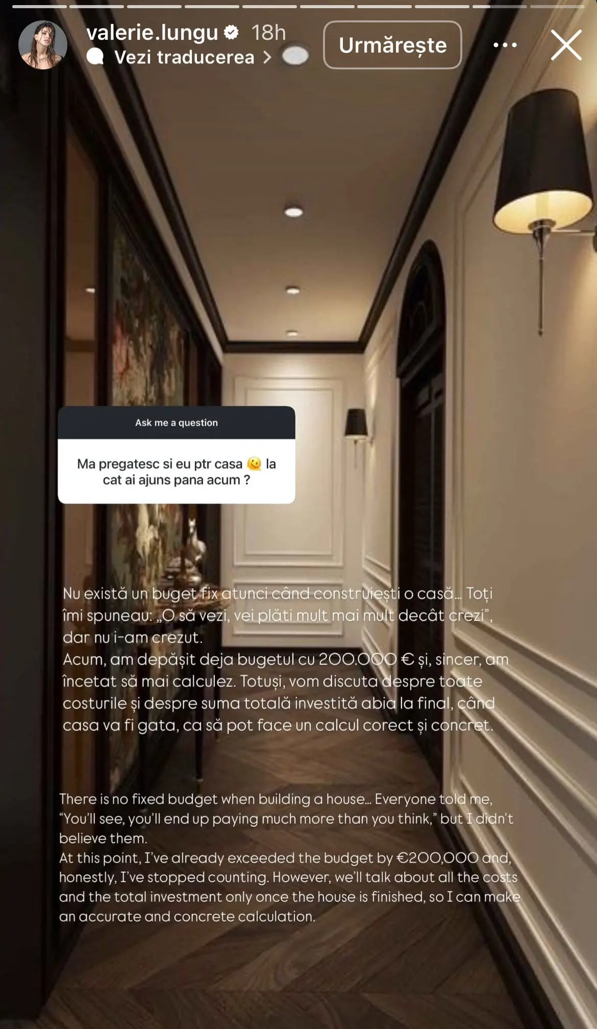 Într-un vlog recent, Valerie a dezvăluit că este în etapa de alegere a materialelor pentru interior și a menționat că deciziile legate de parchet și mobilier sunt unele dintre cele mai dificile. De asemenea, a precizat că locuința nu are încă uși, iar muncitorii lucrează în condiții mai puțin confortabile.