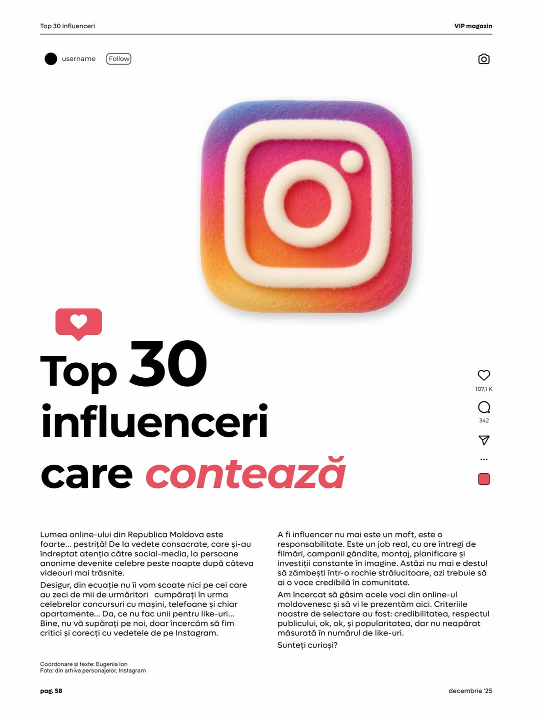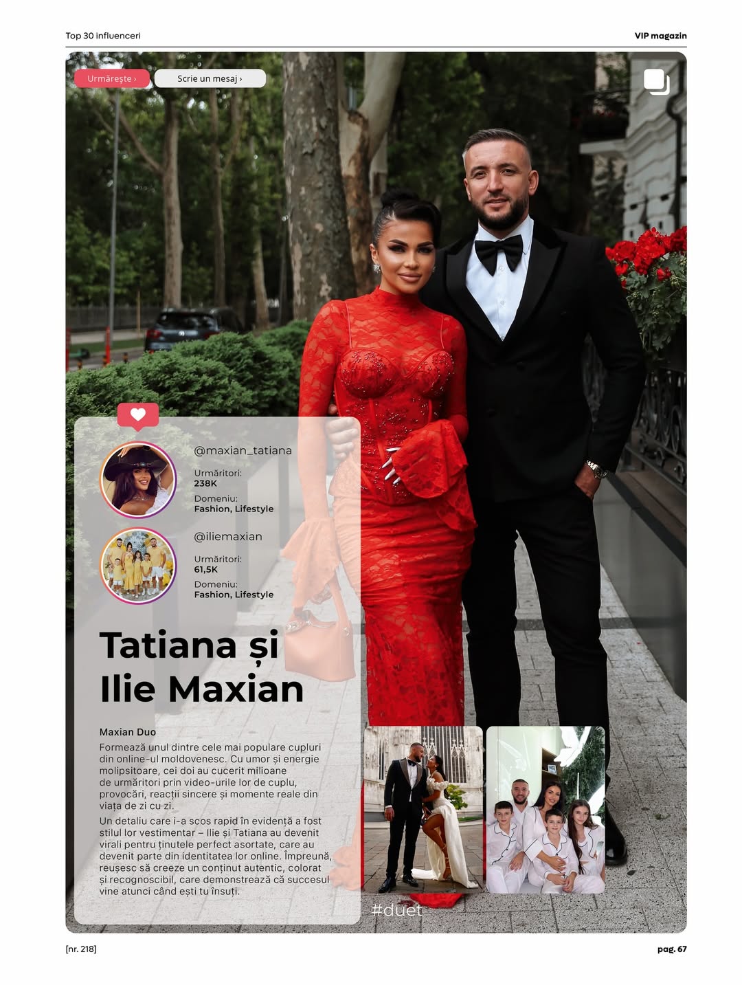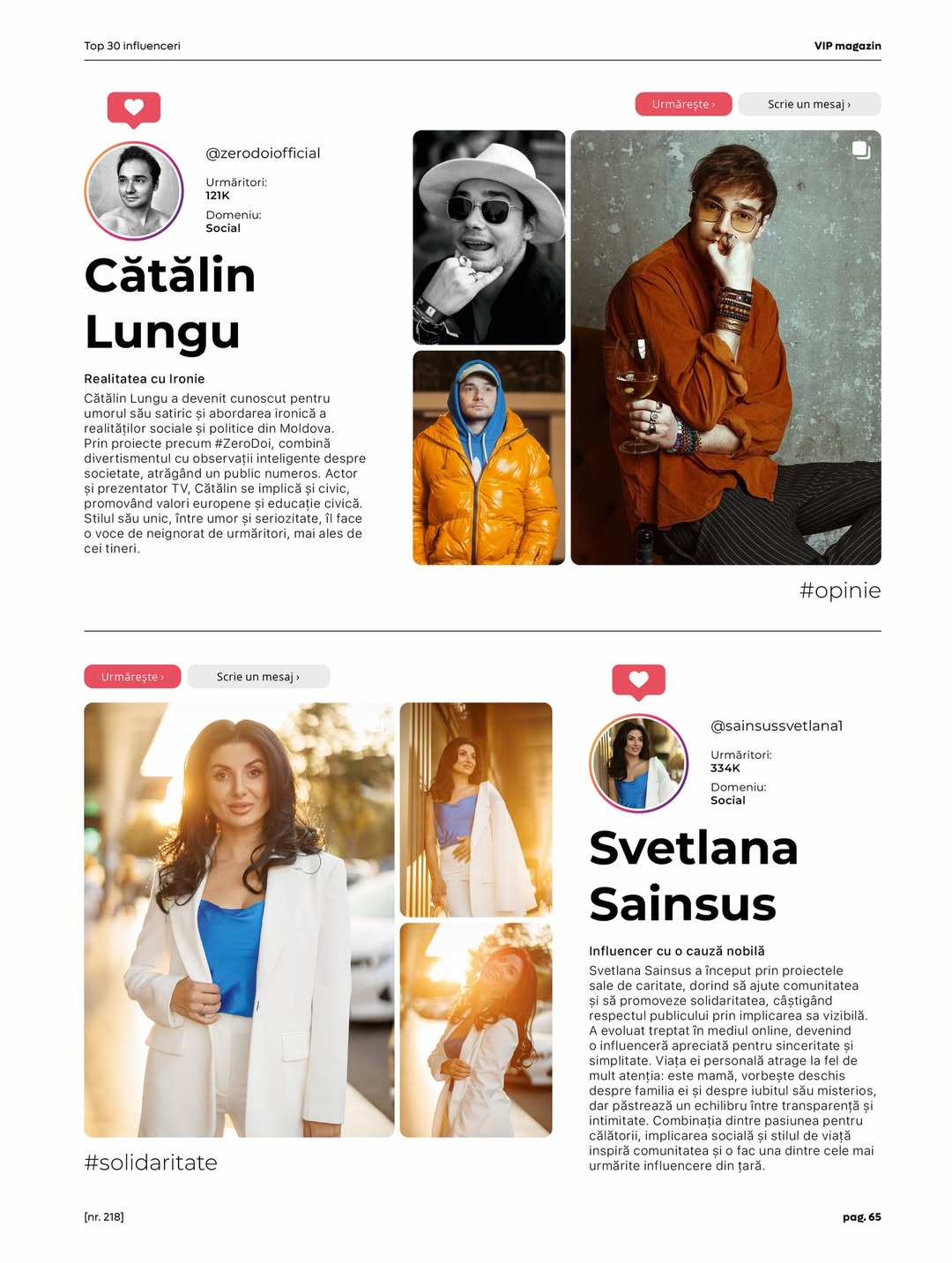 Revista VIP Magazin a creat un top din 30 de influenceri autohtoni, care contează, potrivit publicației. În top au fost incluși de la afaceriști, la familii populare, vedete de televiziune, actori și alții care au reușit să se afirme sonor în mediul online, lăudându-se cu aprecierea internauților și prin urmare, cu contracte publicitare grase.