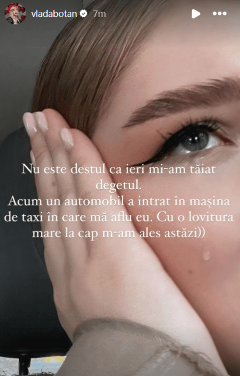 Tânăra a scris pe Instagram că o mașină a lovit taxi-ul cu care se deplasa aceasta. În urma impactului, s-a ales nu doar cu sperietură, dar și cu o lovitură la cap.