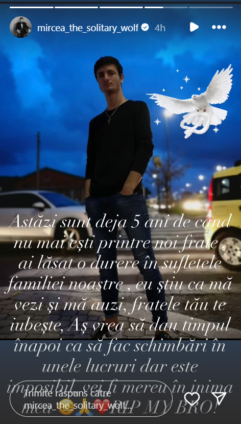 „Sunt 5 ani de când nu mai ești printre noi frate, ai lăsat o durere în sufletele familiei noastre, eu știu că mă vezi și mă auzi, fratele tău te iubește. Aș vrea să dau timpul înapoi și să fac schimbări în unele lucruri, dar este imposibil. Vei fi mere în inima mea. RIP MY BRO”, a scris luptătorul.